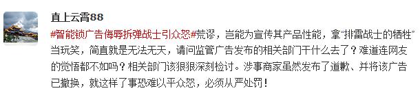 近日,“凱迪仕智能鎖”新浪微博賬號發(fā)布的一則“拆彈磚家”視頻廣告引發(fā)爭議。視頻中,為宣傳其產(chǎn)品“只有一只手也能開鎖”的性能,使用了“排雷戰(zhàn)士”被炸得粉身碎骨回到家的情節(jié),甚至還安排了“排雷戰(zhàn)士”被“炸”成了綿羊、輪胎、電飯煲。江蘇省公安廳網(wǎng)絡安全保衛(wèi)總隊官方微博批評稱,“網(wǎng)絡營銷應有最起碼的道德是非觀念,不要把無知當創(chuàng)意,把惡搞當搞笑!”