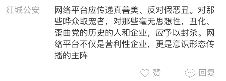 網(wǎng)友“紅城公安”:網(wǎng)絡平臺不僅是營利性企業(yè),更是意識形態(tài)傳播的主陣地,應拿出基本責任感,傳播國家和民族的優(yōu)秀文化傳統(tǒng)。