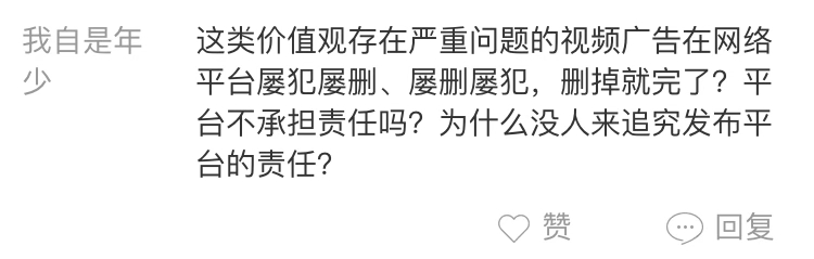 網(wǎng)友“我自是年少”:這類價值觀存在嚴重問題的視頻廣告在網(wǎng)絡平臺屢犯屢刪、屢刪屢犯,刪掉就完了?平臺不承擔責任嗎?